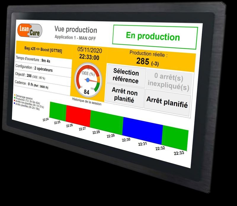 Leancure MES 4.0 est un système de suivi de production en temps réel fortement orienté sur le management visuel. Il s’agit d’une solution à la fois flexible, autonome et compacte qui permet d’afficher la productivité en temps réel et d’enregistrer tous les événements dits « parasites » qui polluent le rendement d’une ligne de production.