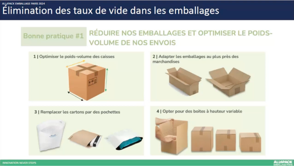 L’efficacité des emballages ne se mesure pas seulement à leur capacité à protéger les produits. Ainsi, lors de ce webinar, Raja et Cubyn ont indiqué qu’ils cherchaient à atteindre un taux de vide de 40%, une mesure clé de la durabilité. Grâce à des logiciels innovants, l’emballage est choisi en fonction de la commande, éliminant ainsi les emballages superflus et réduisant l’impact environnemental.